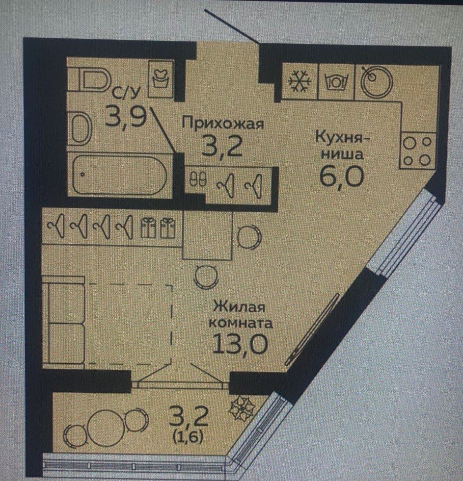 Площадь (общая/жилая/кухни) 26.4/13/6 кв. м